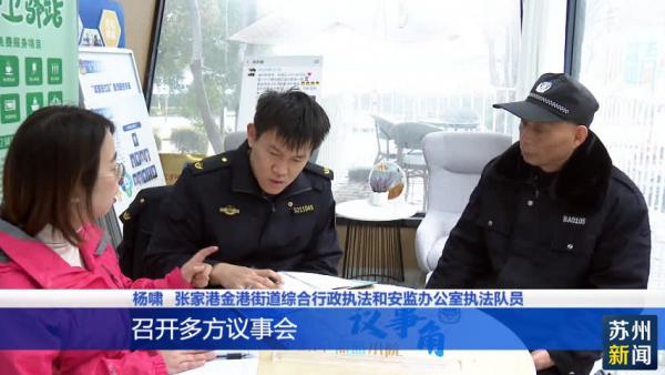 张家港金港街道综合行政执法和安监办公室执法队员杨啸表示,在现场给商家开具了责令整改通知书,随后和商家进行了现场沟通,并且也联系了社区居委会、居民代表以及物业的相关人员召开多方议事会,在工作室内,商户同意了解决方案,并表示将会如期整改。